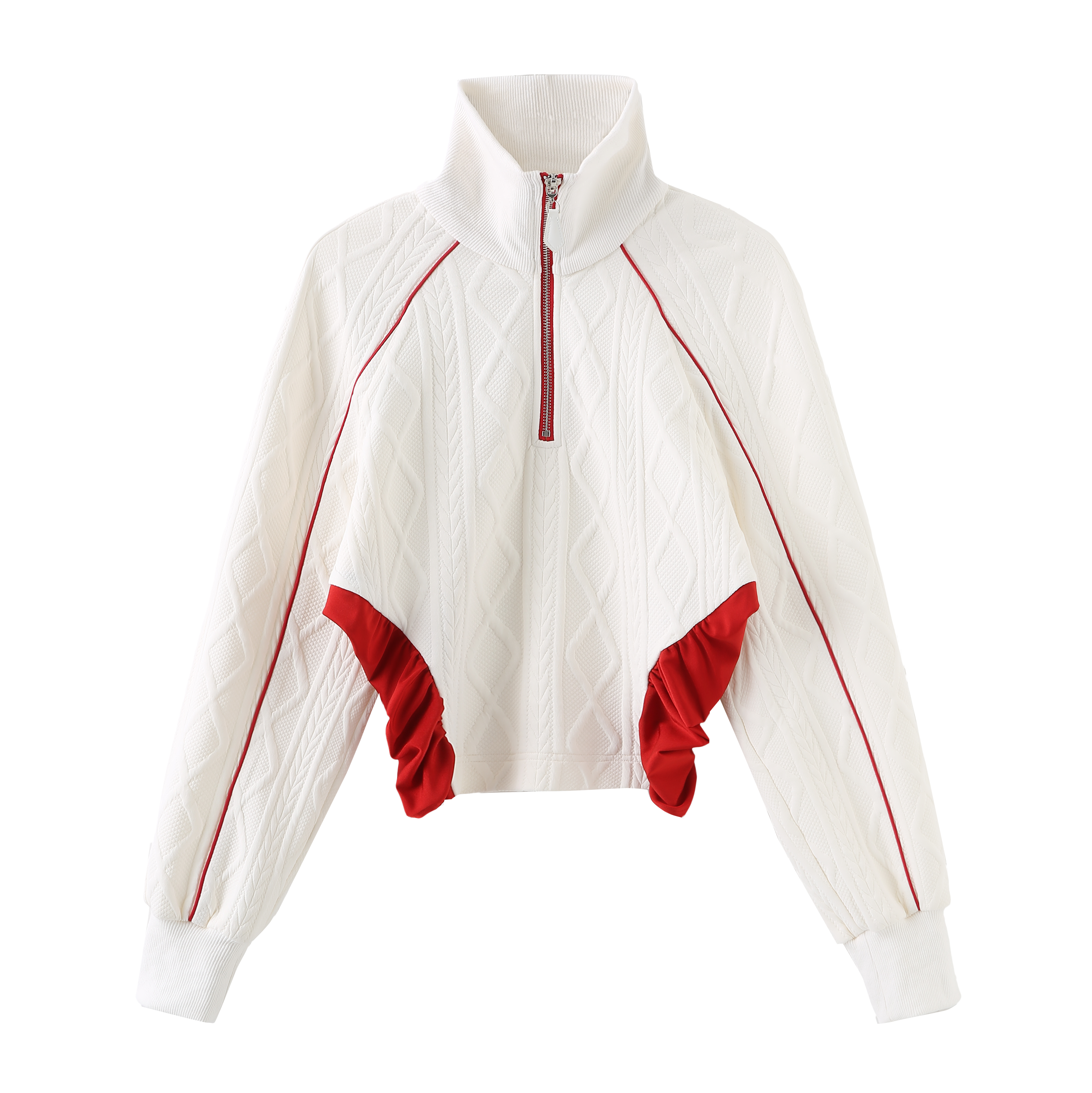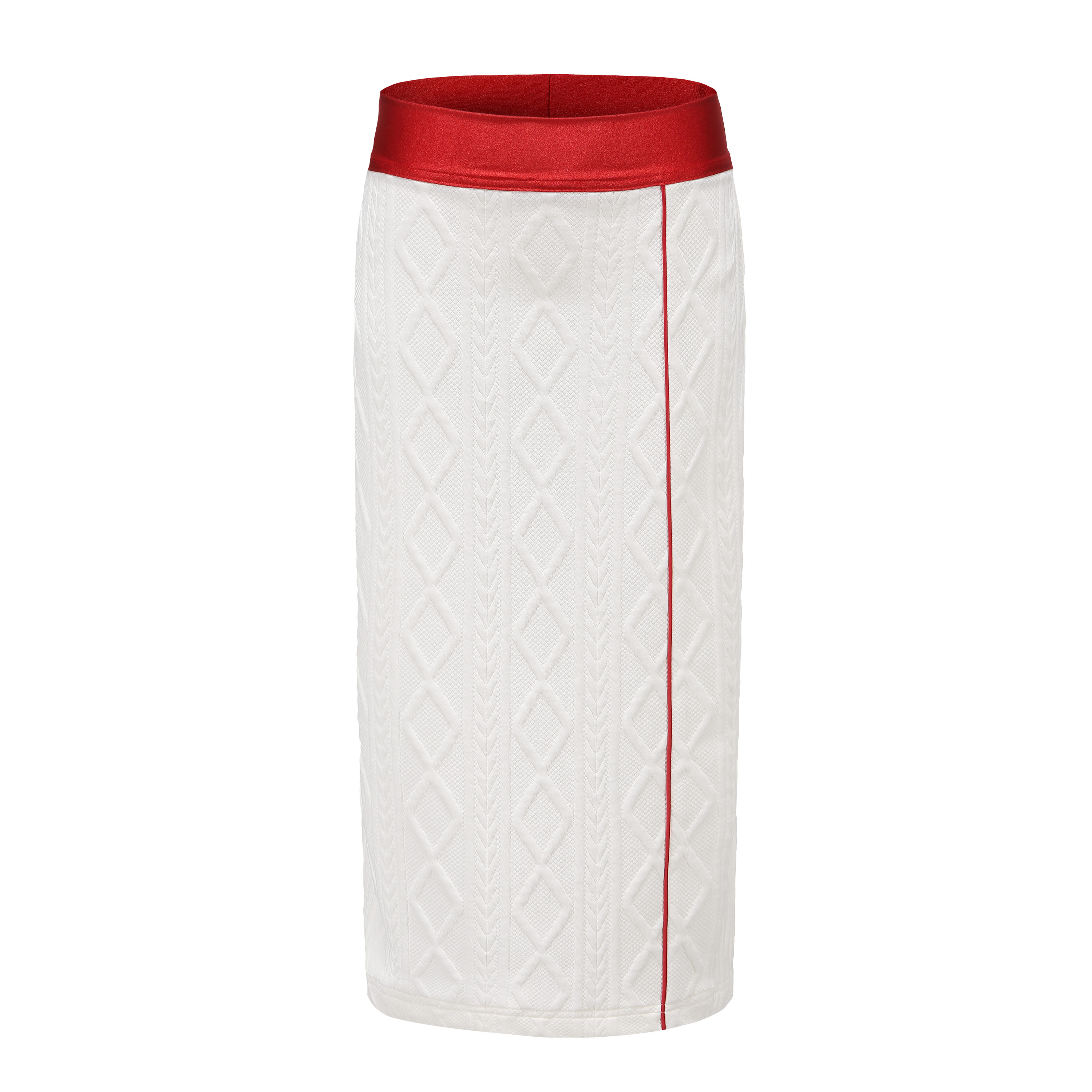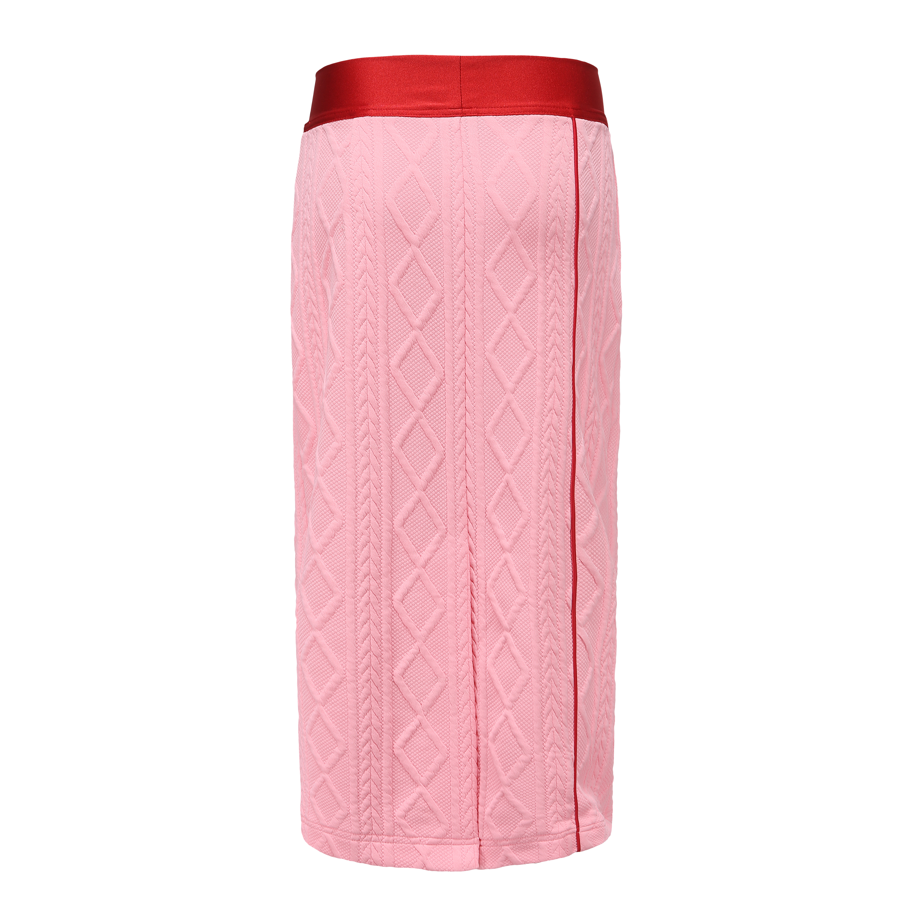 Long sleeve tight technical sweatshirt in white/pink and red featuring logo at back collar, matching with straight skirt.